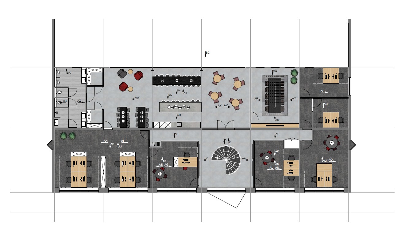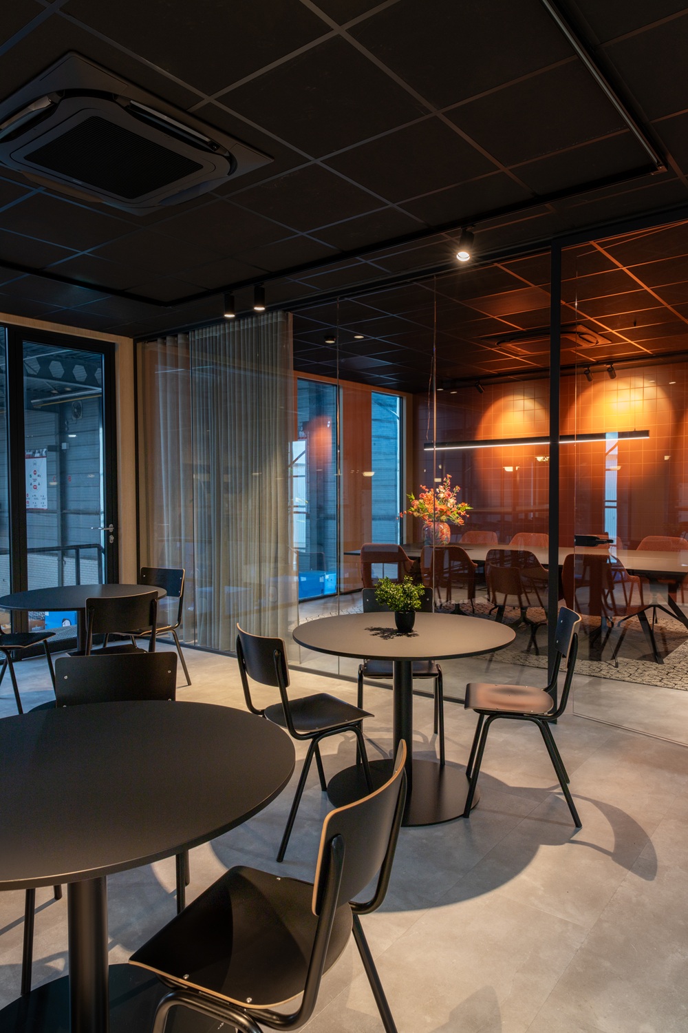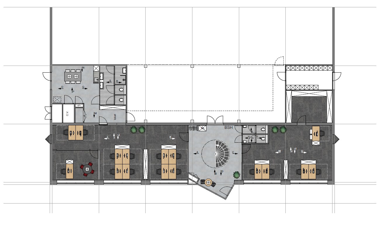 Voor Mammoet Road Cargo ontwierpen we het volledige interieur van hun kantoorpand in Oudenbosch. Beide verdiepingen gingen volledig op de schop: muren werden verplaatst, wanden verwijderd en ruimtes opnieuw vormgegeven. Vanuit de nieuw gebouwde kantine op de eerste verdieping biedt een grote glaswand nu zicht op de loods– een doorkijk die letterlijk de verbinding legt tussen kantoor en operatie.